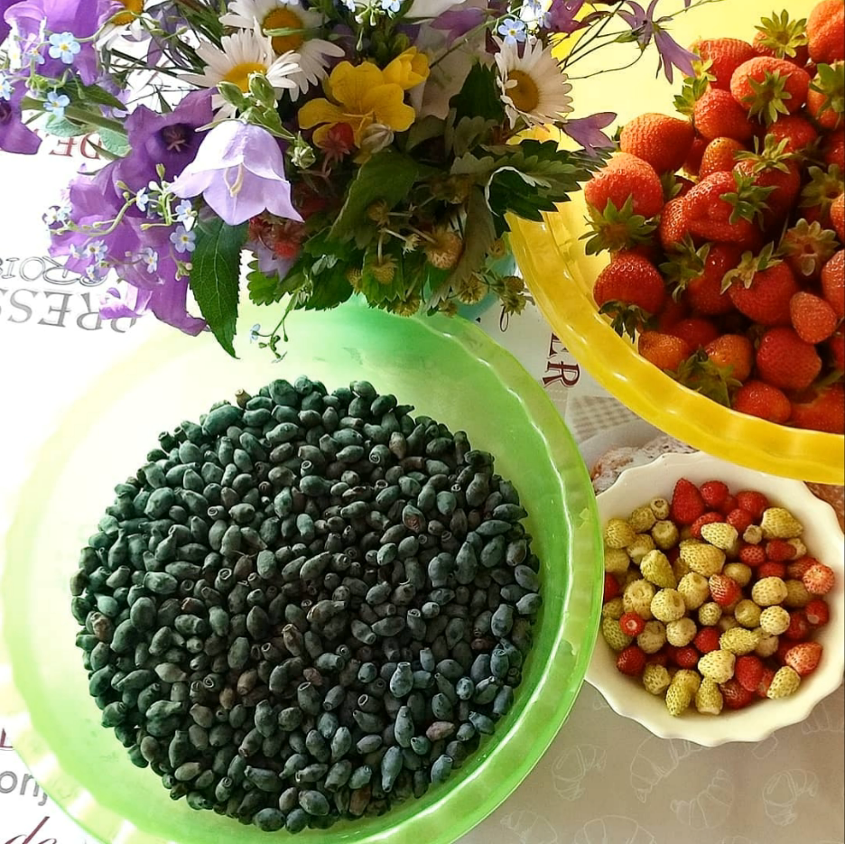 Жимолость съедобная: 7 фактов Нет, не клубника, не смородина, а именно жимолость и облепиха ассоциируются у меня с детством! И очень радуюсь, что мои вкусовые предпочтения передались сынуле! Итак, что же известно о жимолости съедобной 1. Самая ранняя ягода (правда, в этом году в Подмосковье немного запаздывает). 2. Безумно витаминная низкокалорийная ягодка несмотря на кислинку и лгкую горчинку (новые сорта более сладкие и крупные; солнце делает ягоду более сладкой, а в прохладную погоду ягоды накапливают больше витамина С). 3. Сажать на 1 участке желательно не менее 3 разных сортов для лучшего опыления. 4. На одном месте куст может расти более 30 лет (на нашем участке есть почти 40летний долгожитель, правда переехал на это место 25 лет назад). 5. Урожай дат на верхних веточках, поэтому обрезать е нужно не по принципу - ниже, значит лучше. 6. Перед заморозкой ягоды лучше не мыть (мы так всегда делали, так как ничем е не обрабатываем). Из замороженной ягоды в осенне-зимний период