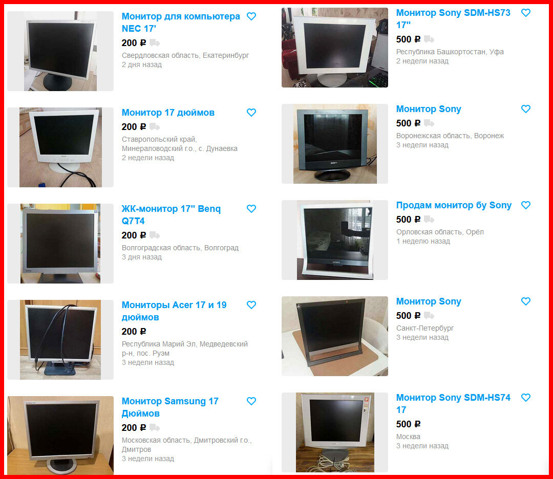 Вторичный рынок мониторов в последнее время стал пахнуть совсем дурно. Проще говоря он «свонялся» (на букву г). И стало выгоднее покупать новые мониторы. Но мой канал не про «новые». Поэтому решено запилить шпаргалку с рекомендованными мной ценами на популярные мониторы. Сегодня у нас квадраты поехали: У всех квадратов лампы подсветки CCFL, все рассматриваемы к покупке мониторы должны иметь DVI вход, если его нет это мусор и место ему на помойке, а не на Авито. 17” 1280x1024 — от ничего до 200 рублей. Исключение мониторы Sony. За них я не задумываясь отдам 500 рублей. Не пытайтесь сторговать за Sony меньше 500 рублей. Лучше подберите монитор другого бренда, к примеру, Dell, HP, IBM, Fujitsu Siemens, NEC — эти мониторы не хуже, а некоторые может даже и лучше. Но справедливая на мой взгляд за них цена — 200 рублей. 19” 1280x1024 — Обходите их мимо, очень крупное зерно (86 PPI). Исключение если такой монитор покупается для тв-приставки. Справедливой будет цена до 500 рублей, но я бы ва