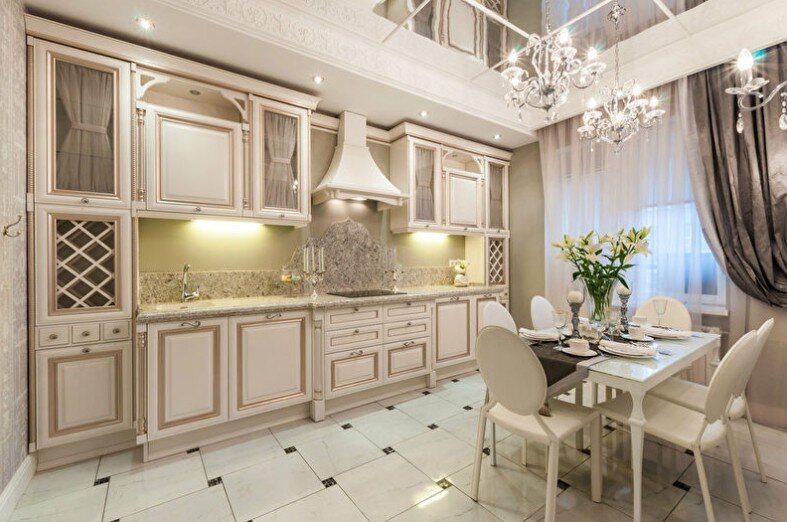 Не случайно, все, что связано с французской тематикой, неразрывно ассоциируется у нас с романтикой, нежностью и любовью. Возможно, по этой причине Франция и является общепризнанной страной влюбленных. Такой же любовью и романтикой пропитаны все интерьеры, выполненные по канонам французского стиля. Не стала исключением в этом случае и кухня. Что же формирует любой стиль оформления интерьера? Безусловно, цветовая палитра, присущая конкретному направлению. Французский стиль кухни отдает предпочтение ярко-желтым и ярко-зеленым оттенкам, которые ассоциируются с красотой сельских пейзажей. Красный и синий цвета подчеркивают красоту контраста маковых полей на фоне чистого неба. Не стоит забывать и о характерных для французского стиля золотом и оранжевом цвете. Но какие бы красивые комбинации не создавались при работе с основными цветами французского интерьера, все же главенствующее место здесь занимает безусловных фаворит всех интерьеров данного стиля - лавандовый. Напольное покрытие во фран