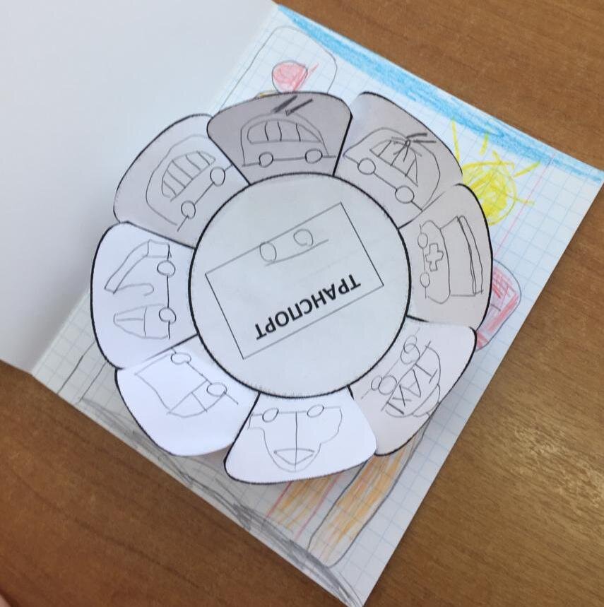 тема "ТРАНСПОРТ" Лэпбук, интерактивная тетрадь – все это новые слова, которые появились в нашем лексиконе сравнительно недавно. Что это такое? Это новый способ обучения с применением интерактивных элементов: кармашки, конвертики, двигающиеся детали, окошечки, сложенные гармошкой детали и т.п. У лэпбука и интерактивной тетради много общего. В первую очередь это цель, которую они преследуют. А именно: в нетрадиционной, интересной, увлекательной, нескучной форме преподнести новый материал, подлежащий изучению. Еще одно несомненное сходство – наличие интересных деталей, в которых как раз и содержится этот новый материал. И лэпбук, и интерактивная тетрадь могут быть как в готовом варианте, так и в формате «сделай сам». Именно такой метод я применяю в работе с детьми-дошкольниками в интерактивной тетради. На данном примере мы закрепляли знания детей о видах транспорта. В качестве шаблона был взят, так называемый, формат «ромашка». На каждом лепестке была нарисована основа любого вида тра