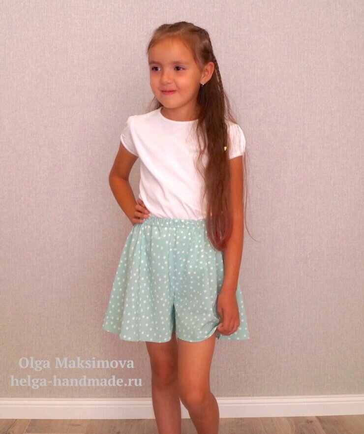 Из остатков лёгкой плательной ткани сшила дочке летнюю юбку-шорты на резинке. Шить быстро и просто. Ткань Супер софт заказывала в магазине «Текстилия». За основу взяла бесплатную выкройку шорт от Кати Мхитарян (ростовка 92-152 см), выкройку можно скачать и в её группе ВК. В МК покажу и расскажу, как моделировала и шила. Итак, берем выкройку передней и задней половинки и склеиваем её в верхней точке, как показано на фото ниже. Раздвигаем выкройку по нижнему срезу на нужную ширину. Так как я шила из остатков ткани, то по нижнему срезу я расширила выкройку на 21 см (это ширина листа А4). Можно расширить побольше, до четверти солнца (так юбочка будет пышнее). Кстати, в выкройке уже заложено 4 см на подгиб пояса. Подкладываем листы и склеиваем. Верхний срез скругляем, подняв примерно на 2,5 см. По нижнему срезу у шагового шва я прибавила по 5 см и плавно скруглила срез, где показано пунктиром. Лишнее отрезаем. Выкройка готова. Переносим её на ткань, прибавив на швы примерно по 1 см с каждой