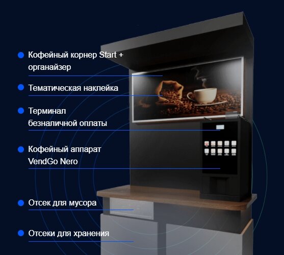 Без кофейных напитков не обходится ни один рабочий день. Поэтому современные офисы оборудуют корнерами. Последние имеют приятный внешний вид и удобство использования. На рынке представлено множество моделей кофе-корнеров. При этом разнообразии выбор модуля все равно затруднен. Компания «VendGo» поможет выбрать автомат который впишется в нужный офис и бюджет. Чем отличается напиток из кофейни от кофе из аппарата? По вкусу они редко сильно отличаются, особенно если в приготовлении используются натуральные зерна. Преимущества корнера в отсутствии очередей и более низких ценах. В состав кофе входит: Каждый ингредиент должен быть в наличии. Поэтому, приобретая в свой офис кофе-корнер, нужно позаботиться о том, чтобы всех компонентов всегда хватало. В вендинговых аппаратах иногда применяют кофейные капсулы. Среди напитков можно заказать: Кроме этого, в кофейных аппаратах, бывают напитки на основе какао. Преимущества кофейного автомата в офисе Почему стоит купить кофе-корнер у нас? Аппараты о