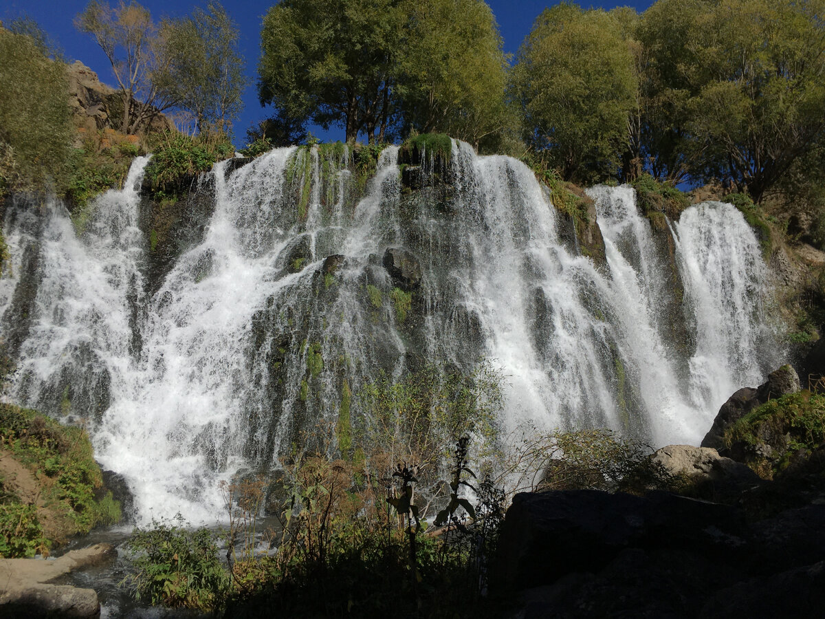По дороге из Джермука в монастырь Татев мы заехали посмотреть на небольшой, но очень симпатичный водопад. Ну, сравнительно небольшой. Все-таки высота Шаки (или Шакинского водопада) восемнадцать метров. Машину оставляем на парковке, пройти до водопада нужно примерно метров 300 - 400. Но сначала наш гид Тигран заводит нас в небольшой лесок - сад с грушами. Мы стали собирать опавшие груши, пробовать их и ждать от Тиграна уже привычного: "Это самые лучшие в мире груши!" За время нашей поездки по Армении, эта фраза звучала постоянно. Яблоки, арбузы, горы и небо - всё это не имело аналогов в других странах)))) Про груши Тигран забыл, мы ему напомнили, он с готовностью подтвердил, что, да, и груши тоже лучше, чем где бы то ни было, мы обрадовались и двинулись к водопаду. На вершину водопада можно подняться по тропинке сбоку. Наверху еще несколько совсем небольших перепадов и быстрый поток, несущийся к краю пропасти. Смотреть вниз не страшно, брызги от воды создают приятную влажность в жарк