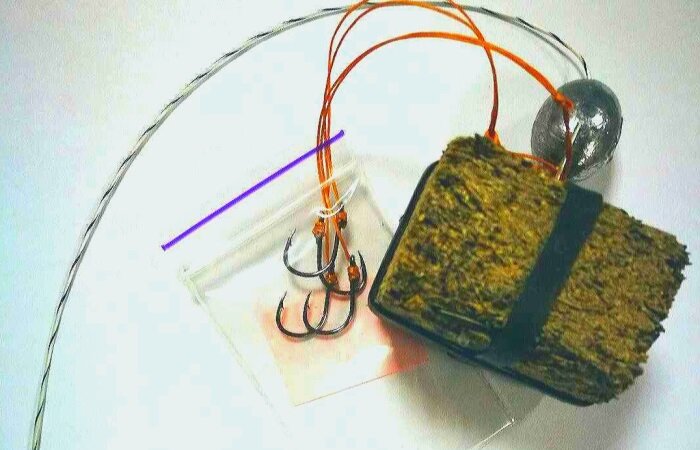 Кубик жмыха крест на крест перехватывается резинкой и в него втыкаются крючки. При ловле на мидию и червя таких хитростей не нужно, можно обойтись одним крючком и скользящим грузилом.