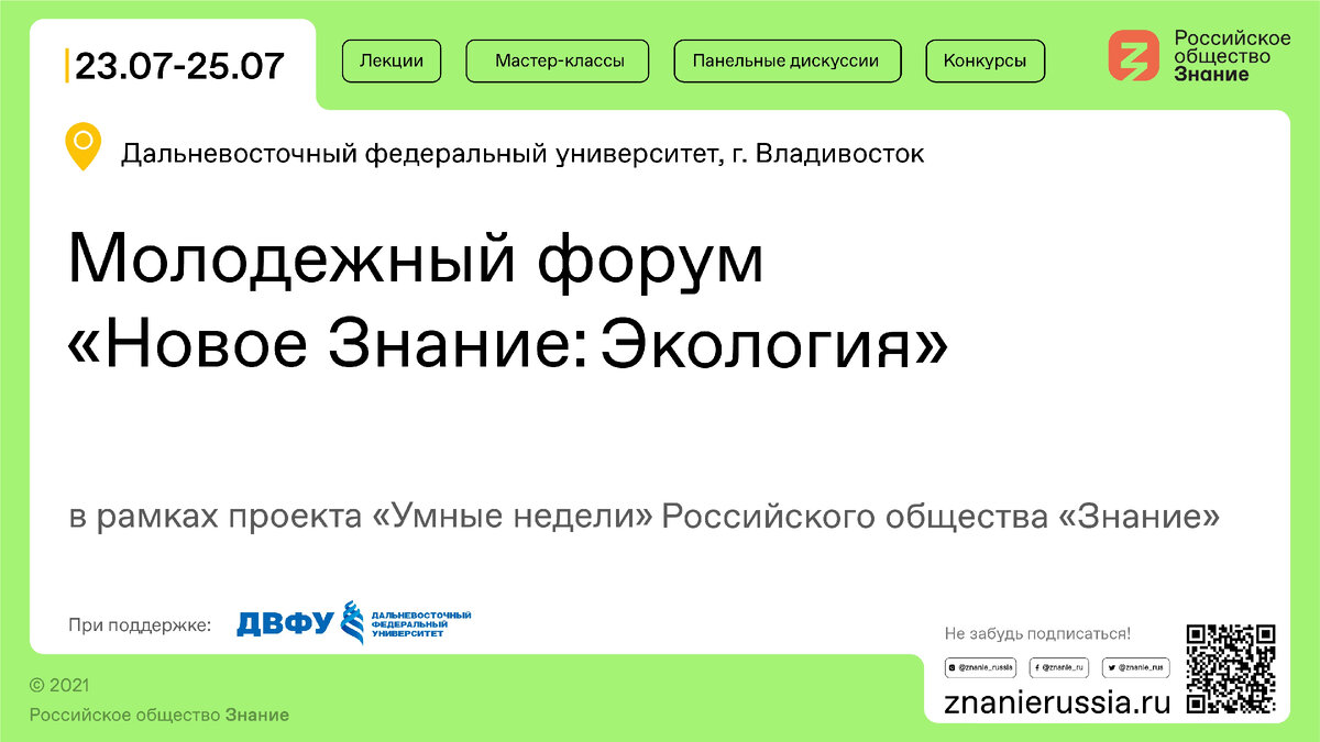 Во Владивостоке стартовал Молодежный форум "Новое Знание: Экология". Площадкой для проведения форума стал кампус Дальневосточного Федерального университета в рамках проекта «Умные недели» при активной поддержке Дальневосточного отделения Российской академии наук. В форуме принимают участие старшеклассники приморских школ и студенты, ученые, эко-активисты, руководители компаний и общественных организаций, представители региональной и городской администрации. "Цель нашего проекта «Умные недели» - создать пространство для получения новых знаний. Сегодня мы собираем вместе ученых-экологов, бизнес, государственных деятелей – авторитетных спикеров, которые делятся своими знаниями с молодежной аудиторией для решения проблем экологии в будущем», – отметил генеральный директор Российского общества «Знание» Максим Древаль. Среди тем обсуждения: сохранение биологического разнообразия Земли, борьба с экологическими проблемами, осознанное потребление, обращение с отходами, волонтерство и проф