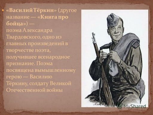 - Александр Твардовский в поэме «Василий Тёркин» описывает простого русского парня, солдата, сражающегося за свою страну. На примере Тёркина автор показывает силу духа всего русского народа. Например, в главе «Переправа» герой переплывает ледяную реку под обстрелом, чтобы выполнить приказ.