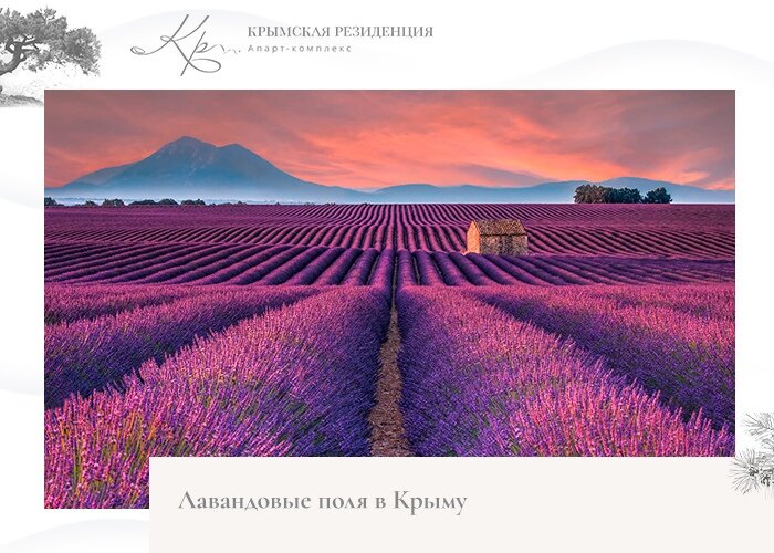Только представьте себе бескрайние поля ярко-фиолетового цвета, наполняющие воздух восхитительным ароматом. Это не Прованс или Италия. Лаванда растет в Крыму. И местные лавандовые поля — отличная идея для оригинальных селфи или профессиональной фотосессии. ✅ Ближе всего к «Крымской Резиденции» находятся лавандовые поля в одноименном поселке Лаванда, расположенном у подножья горы Демерджи, между Алуштинской трассой и селом Лучистое. ✅ Самые большие лавандовые плантации вы найдете в Бахчисарайском районе, в частности — в селе Тургеневка. ✅ Много площадей засеяно около поселка Крымская Роза вблизи Симферополя, по Белогорской трассе. ✅ В восточном направлении до Судака также много лавандовых полей, их можно найти возле поселков Мазанка, Лекарственное и Водное. ✅ В западной части Крыма поля с лавандой сосредоточены в районе поселка Оленевка на мысе Тарханкут, рядом с Учкуевкой и Андреевкой. Выбирайте апартаменты в «Крымской Резиденции», чтобы наслаждаться красотой природы тогда, когда душа