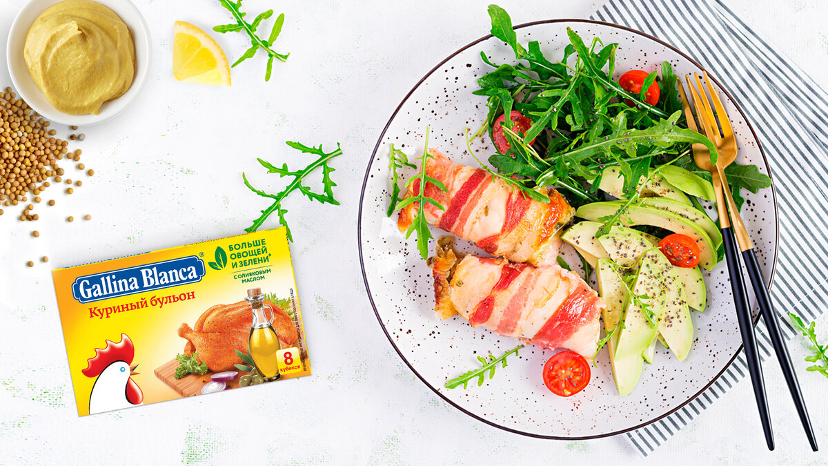 Второе блюдо. Время приготовления: 20 -40 минут. Уровень: Лёгкий Ингредиенты Как приготовить Роллы из курицы в беконе Шаг 1 Куриное филе нарежьте полосками средней толщины так, чтобы получилось около 20 штук. Заверните каждую в бекон, предварительно добавив к рулетикам немного «Куриного бульона» Gallina Blanca. Получившиеся рулетики выложите на противень в один слой. Шаг 2 В миске соедините горчицу, мёд и лимонный сок, перемешайте. Смажьте рулетики маринадом и запекайте в разогретой до 200°С духовке 20-30 минут до полной готовности. Шаг 3 Подавайте блюдо с зеленью и гарниром, например, с ломтиками авокадо. Больше рецептов на gallinablanca.ru