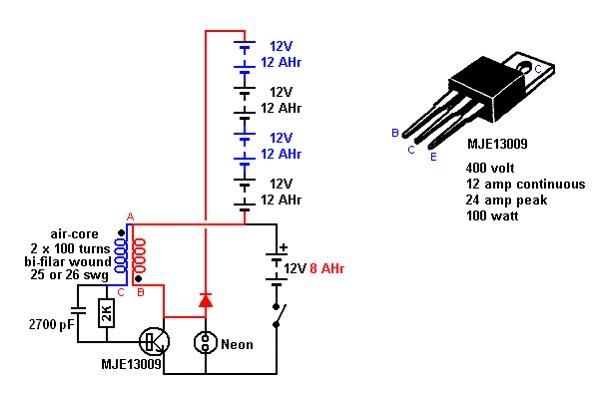 Это особенно простая схема, позволяющая заряжать батарею на 12 В, 8 ампер-часов и 48 В.