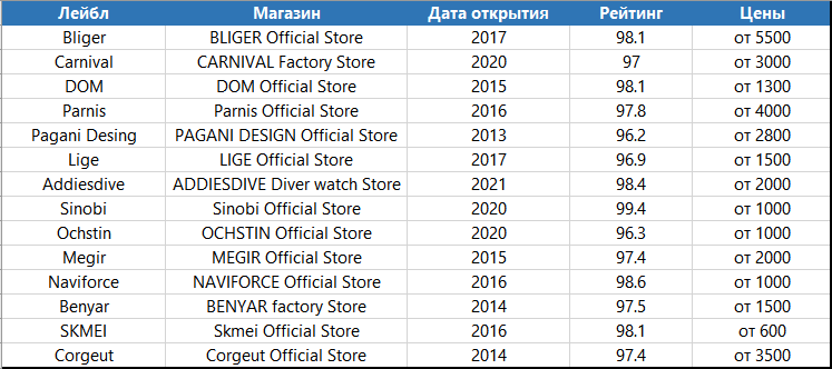 В процессе поиска не дорогих часов на каждый день, составил для себя небольшую табличку по производителям. Учитывал только производителей с высоким количеством продаж.