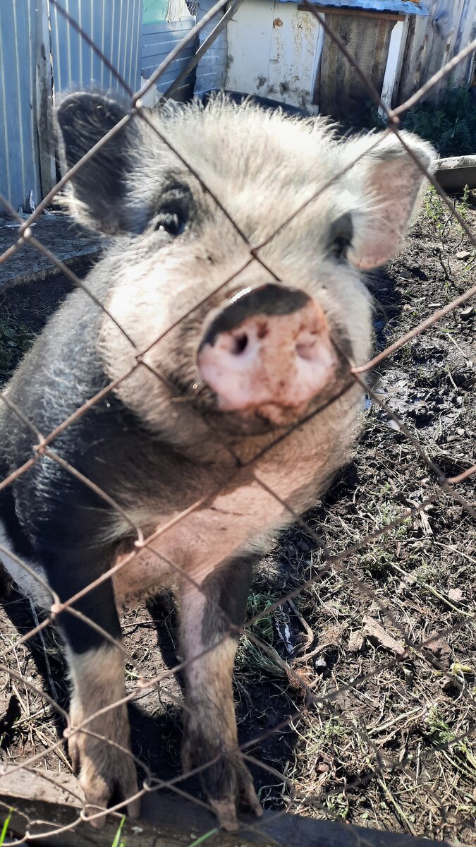 А так всё хорошо начиналось) Нашла я себе нового производителя, такой красивый поросёночек, далеко за ним ехать - не проблема, семь вёрст не крюк, и дальше ездили. В нашем регионе вьетнамцев мало, а если и есть то помешаны со всеми подряд - простые белые, мангалицы. И получается уже не вьетнамец, а совсем другой товарищ. А мне вот надо чтоб чистокровный вьетнамец, да с носительством белого окраса, чтоб глазу зацепиться за что было. Вообщем красоту мне подавай))) Привезли мы этого поросёнка - красавец! В очках, в черном пиджаке, всё как я люблю) Только в нагрузку к пиджаку - противный характер. Вот все спокойные, только он один спокойно спать мне не даёт. Переехал он у нас в отдельный загон, и понеслась карета по кочкам. Сначала подкопы делал в соседний загон, к старшему хряку. Положили с мужем в загон плиты, от старого бетонного забора. Копать перестал, стал ломать сетку. Закрыли сетку, оставались пластиковые панели после ремонта. Этого товарища в пиджаке хватило на неделю, пока он н