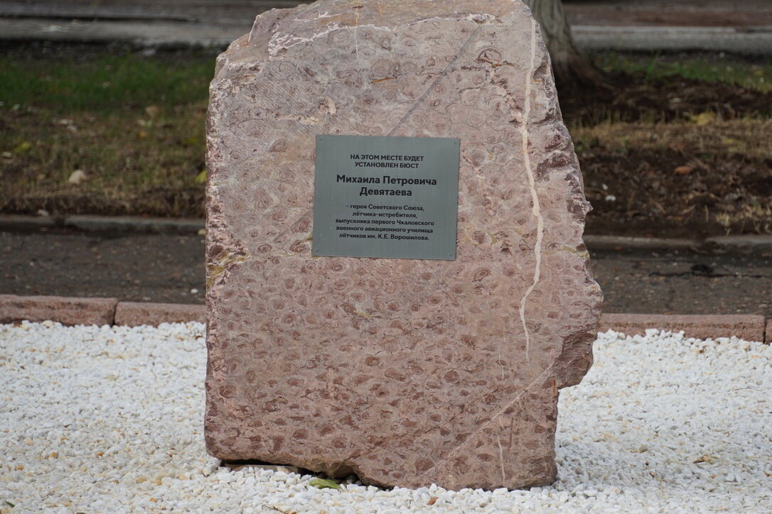 На территории школы №39 в Оренбурге установят памятный бюст Героя Советского Союза Михаила Девятаева. В четверг, 22 июля, на месте будущего бюста заложили камень. В событии принимал участие сын Героя Александр Девятаев. Бюст отольют из бронзы и установят на гранитный постамент. В этот раз, по просьбе сына, бюст Михаила Девятаева выполнят не во всем узнаваемом по послевоенным фотографиям облике, а в образе курсанта оренбургской «летки». Средства на установку монумента памяти легендарному летчику собрали в марте 2021 года на благотворительном спектакле «Гостиница «Астория». Напомним, что Михаил Девятаев окончил Чкаловское военно-авиационное училище в 1940 году. Отправился на фронт в первый же день Великой Отечественной войны. И уже 24 июня Во время очередного боевого вылета, отражая вражескую атаку, 13 июля 1944 года он сбил немецкий истребитель над городом Гороховым (Украина). Но и его самолет тоже подбили и Михаил Девятаев попал в плен к немцам. Михаил Девятаев собрал группу единомышле