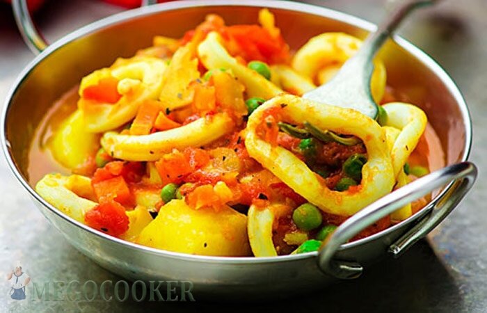 Рецепт картошки с кальмарами в мультиварке Сочетание картофеля с морепродуктами очень популярно в итальянской кухне, и вообще в кухне Средиземноморья, взять тот же мега-популярный салат с осьминогом. Но осьминоги нынче очень дороги, а вот привычные и родные кальмары все еще достаточно бюджетны. Ингредиенты: Способ приготовления: 1. Сперва порежем мелко репчатый лук, чеснок и морковь, для того, чтоб наполнить наше блюдо ароматами. Если у вас есть под рукой стебель сельдерея, будет хорошо и его добавить, для полноты букета. 2. Нагреем нашу мультиварку в режиме «Жарка» и нальем в чашу растительное масло, лучше оливковое, но это не столь принципиально. В масло насыплем орегано сушеный, и следом за ним отправим все наши измельченные овощи, пусть зазолотятся и размягчатся, готовим их минут десять. 3. Вольем белое сухое вино (любое недорогое, которое есть в наличии) и дадим ему выпариться — этот прием очень улучшает вкус и аромат блюда. Теперь вливаем томаты, консервированные в собственно