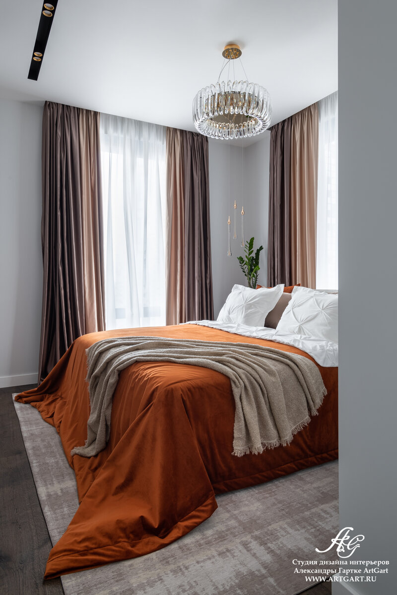 Фото спальни в реализованном проекте #преснясити65 Планировка спальни не стандартная, с 2 окнами, у окна можно было поставить телевизор или кровать. Выбирая из двух вариантов решили поставить кровать у окна. На окне установлен электрокарниз, поэтому за спинку кровати не придется! Из-за того, что в этом проекте мы в ходе реализации расширили кабинет, пришлось внести изменения в проект соседней спальни. В результате получилось минус шкаф и минус камин, поэтому планировка в целом слегка изменилась. Спальня в довольно нестандартном цвете жидкой меди, который вообще используют довольно редко! Но использовали мы его только в текстиле. Если со временем хозяева от этого цвета устанут, можно будет просто заменить на другой. Сочетание оттенков деревянной мебели и пола идеальное! Мы приехали к производителям мебели с образцами пола, и они изготовили все в ровно таком же оттенке. Поделитесь вашим мнением в комментариях. Мы будем очень рады его услышать! Не забудьте подписаться на канал Са