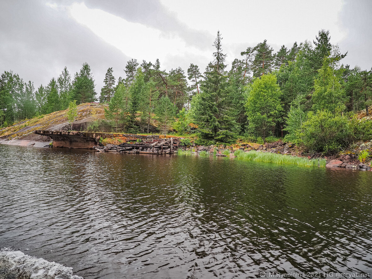 Путешествуя по Ладожским шхерам можно добраться до странного острова, на котором остались руины бетонных зданий и строений. На первый взгляд не очень понятно, что это, но по словам местных это были закрытые территории, на которых располагались базы военных и, в частности, военные склады. Остатки бетонного сооружения, больше всего привлекающего внимание, это бывший пирс, к которому приставали для погрузки и разгрузки боеприпасов и снаряжения корабли. Поговаривают, что тут были и подводные лодки. Это звучит как-то не особо правдоподобно, но это действительно так - лодки были переброшены в озеро по железной дороге еще в 1943-м году. Если прогуляться по острову или присмотреться с воды, то можно обнаружить и остатки бетонных бункеров, в которых и хранились те самые боеприпасы, которые привозили по воде. У нас не было времени полазить по бункерам и точно не могу сказать, насколько они доступны. Острова на Ладоге буквально созданы для военных - прочный камень, вокруг вода, естественная маски