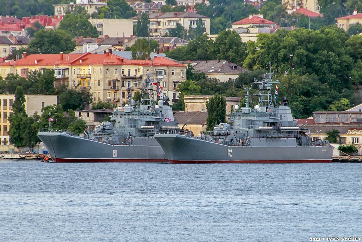 1. Начнем с классического направления взгляда с причала Северная в сторону Графской пристани, чуть левее. И вот что любопытно: ранее эти два БДК (больших десантных корабля) были скрыты (по крайней мере для меня, когда я бывал там ранее) корпусами других кораблей. А сейчас перед нами близнецы (знаю, принято говорить систер-шипы, но это английское восприятие корабля, как женщины, мне ближе мужское русское - борт) БДК "Цезарь Куников" (бортовой номер 158) и БДК "Новочеркасск" (бортовой - 142)