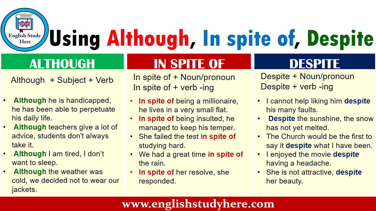 ALTHOUGH = THOUGH = EVEN THOUGH После although (хотя; несмотря на то, что) мы используем подлежащее + сказуемое!!!!!! В разговорном английском мы часто используем though в конце предложения: Even though – более сильная форма, чем although: После in spite of или despite (= несмотря на), мы используем = существительное = прилагательное + сущ = местоимение this/that/what/his/her !!!! =V -ing: Вы можете сказать in spite of the fact (that) ... и despite the fact (that) = ПОСЛЕ ЭТИХ ФРАЗ ИСП-СЯ ЦЕЛОЕ предложение!!!!! 1. Although the watch was expensive, he bought it.