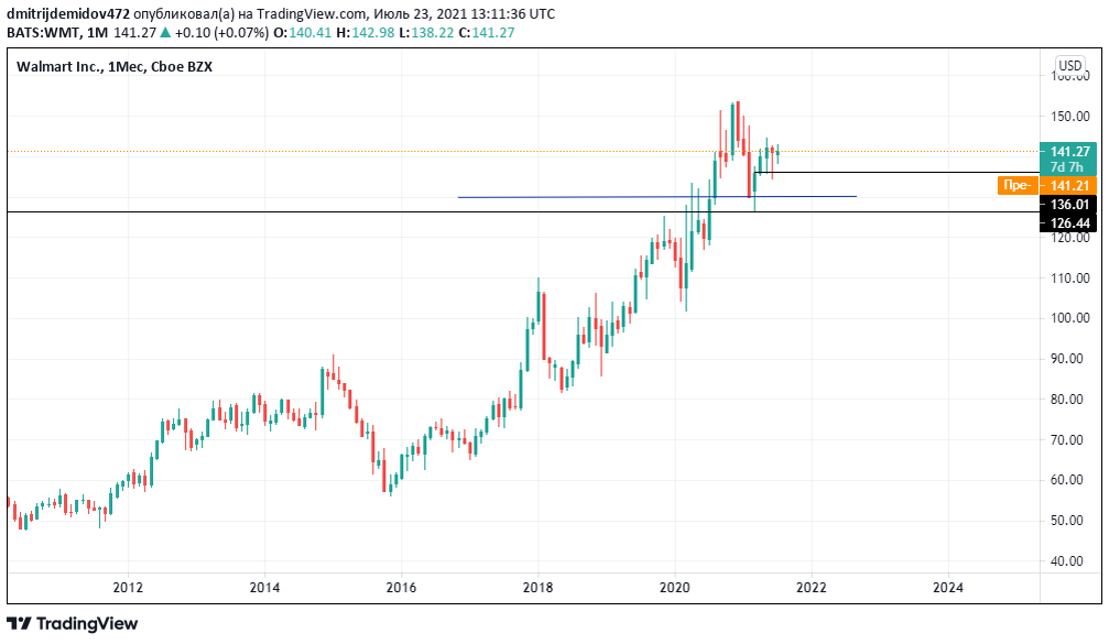 Приветствую. На сегодня я решил просто предложить вам обратить внимание на следующие компании. Ориентировочно стоит рассматривать их в долгосрочной перспективе. Акции Walmart: Среднесрочная идея по тренду. В обзоре российского фондового рынка я говорил, что российский Ритейл себя неважно чувствует и это мягко сказано, но если мы говорим про рынок США, то там все идет ровным образом наоборот. Видите на месячном графике пинбары – это указание на откупы по тренду. Также и тренд идет по направлению рынка, а это достаточно хороший сигнал для розничных трейдеров. Акции Palantir: Эта инвестиция с большим риском, чем первая. Про Палантир вы наслышаны давно и у нас был большой обзор по этой компании. В целом, его можно назвать единорогом, который успешно вышел на биржу и теперь все зависит от личных успехов компании. Интересный факт, что в этой компании есть доля Арк Инвест, инвестиционной компании Кэтрин Вуд, которая известна своими инвестициями в компании, способные изменить мир. Рекомендую д