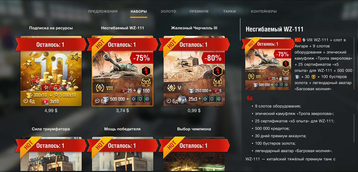 Сегодня, на момент написания статьи (23.07.2021), случился любопытный казус. Обычно я захожу в Блиц через смартфон или планшет. Но сегодня зашел через ПК. И в премиум магазина увидел кое-что интересное: Друзья, что вы тут видите? Вон эти предложения, где третий Черчиль и китайский ВЗ 111? А если увеличить? Вы видите, что и за сколько тут выставили? Там где Черчиль, 14 дней према, четверть ляма серебра и по 25 различных бустеров, где проглядываются "голдовые". И все за бакс??? Или там, где прем танк VIII уровня, месяц према, пол ляма серебра, и сотней (!!!) бустеров на голду, менее чем за 4 бакса??? Я уже не говорю про то, что все это с оборудкой, камуфляжами и аватарами. Я даже не упоминаю сертификаты на х5. Но там даже просто прем аккаунты по вкуснейшей цене. И знаете что я сделал? Ничего. Я просто решил оставить это на потом. А знаете что произошло дальше? Правильно, это предложение оказалось ошибкой, и оно исчезло. Мне очень интересно, успел ли кто купить это? Скорее всего, такое б