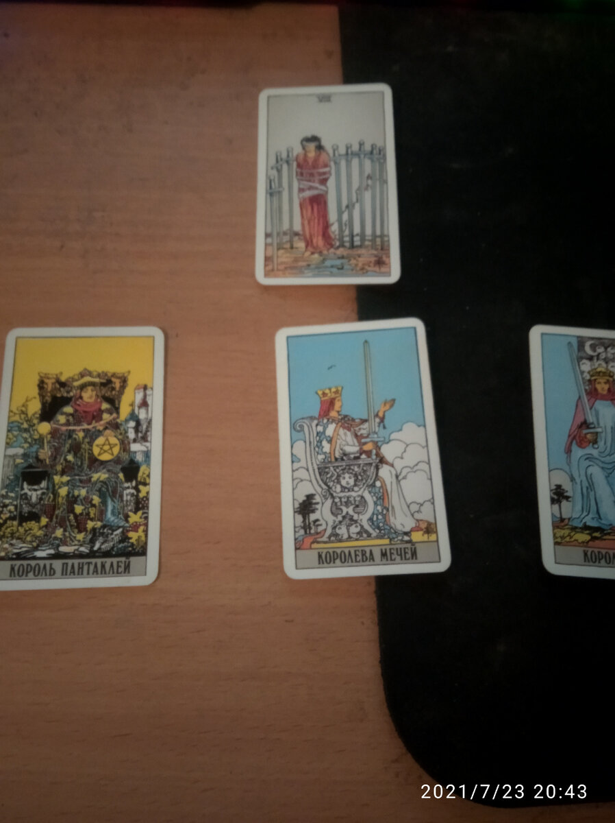 В раскладе королева мечей находится между двумя королями и она скована узами. Это значит что женщина мечется между двумя мужчинами и не может выбрать одного из них. И отношения это своего рода замкнутый любовный треугольник который женщине сложно будет разорвать в следствии чего она будет страдать и мучиться от безысходности и безнадёжности.