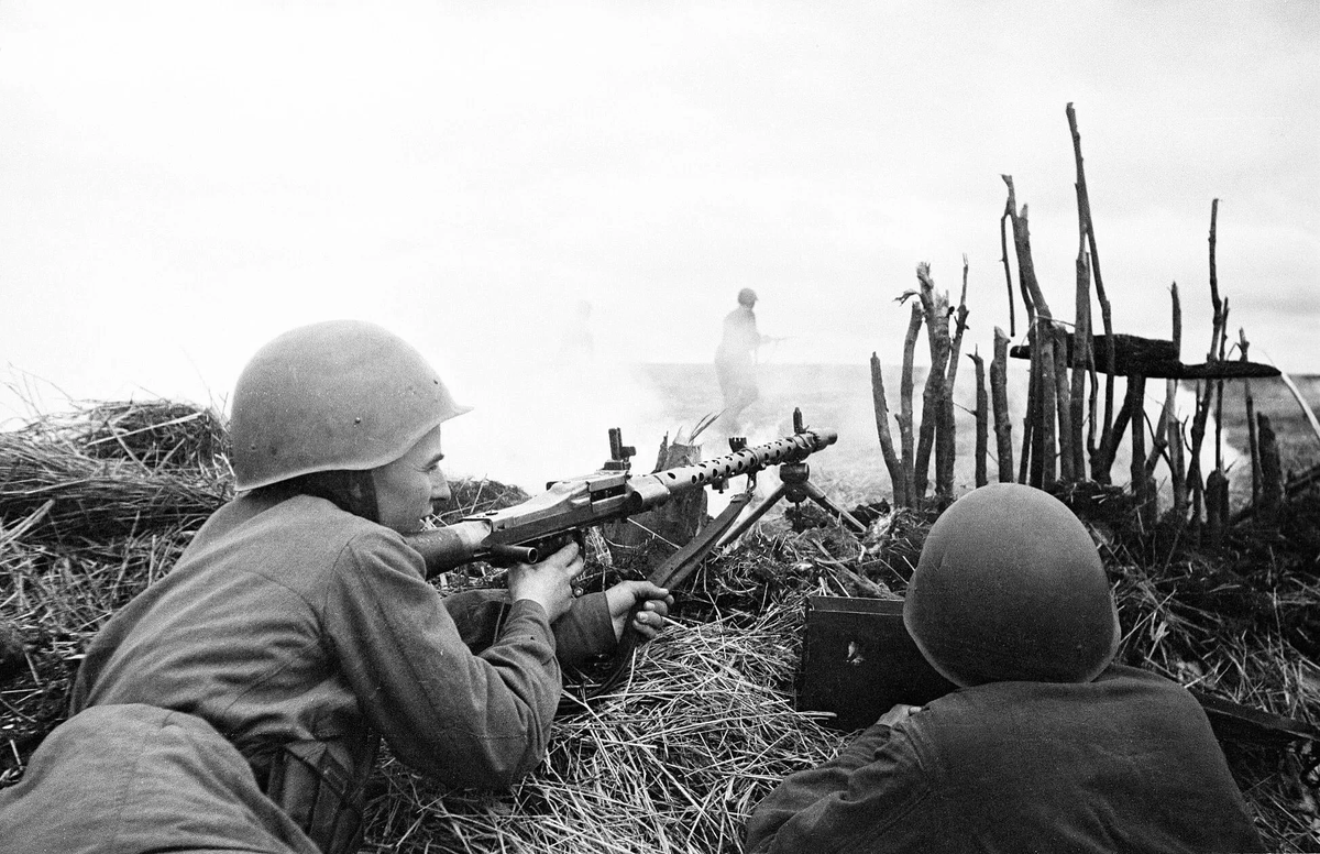 Новиков не придерживался линии связи и шагал, как ему удобнее. Новую передовую он, видимо, представлял плохо: вдруг прямо над нашими головами раздались свист пуль и резкая трель близкой автоматной очереди. В это время мы шли через лесную вырубку, напоминавшую по форме квадрат, с редкими небольшими кустиками и одиночными деревьями. Пули просвистели, когда мы уже приближались к окружавшему вырубку лесу. Мы инстинктивно бросились на землю. Однако это не спасло. Пули снова с громким стуком взрыли землю прямо перед нашими головами. Мы вскочили и что было сил бросились к спасительному лесу. Еще одна очередь, еще и еще… Не знаю, что страшнее – близкий разрыв бомбы либо снаряда или свистящие и бьющие по земле рядом с тобой пули немецкого автоматчика. Пожалуй, одинаково. То падая на землю, то бросаясь вперед, когда отсвистят пули, мы преодолели оставшуюся до леса сотню метров. В лесу сразу увидели блиндаж с амбразурой в нашу сторону и бросились к нему. В блиндаже находились двое красноармейцев. Один, раненый, с перевязанной бинтом шеей, лежал без сознания, тяжело дыша с хрипом и бульканьем. Второй встретил нас руганью: