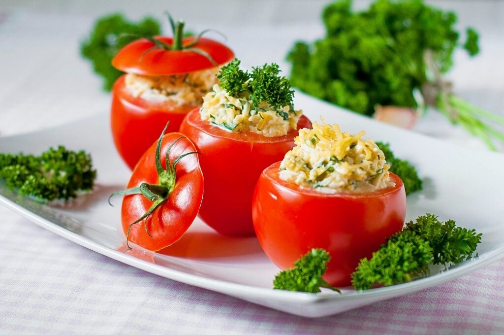 Помидоры 120, Грибы 40 Лук репчатый или зеленый 25, Заправка салатная 15 или сметана 15, Перец. Добрый день, дорогие друзья! Сегодня делюсь рецептом помидоров, фаршированных грибами. Спелые помидоры (по два на порцию) обработать, срезать верхнюю часть, слегка отжать для удаления сока и семян, сделать в помидорах углубление и посыпать солью и перцем. Помидоры наполнить фаршем, посыпать зеленью. Для фарша использовать грибы. Соленые или маринованные грибы (белые, рыжики, или грузди) мелко нашинковать, соединить с мелко нарезанным луком и заправить салатной заправкой (смешанные растительное масло, уксус, соль, сахар и молотый перец) или сметаной, солью и перцем. Помидоры можно фаршировать овощным салатом и грибной икрой. Приятного аппетита!