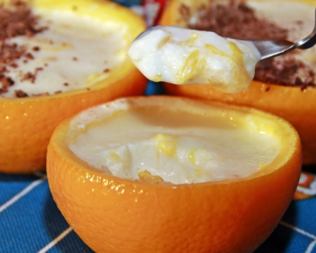 5. Полученную смесь в тарелке, разлейте в четыре чашечки из под апельсинов. Поставьте в морозилку на 2-3 часа.