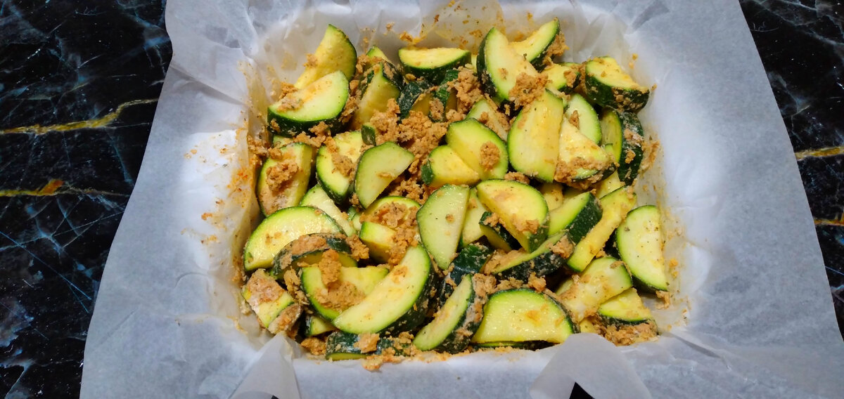 Блюдо сытное и очень вкусное, готовится легко и просто. Даже посуду не придется марать для его приготовления. Кладу все в форму, смешиваю и запекаю! Рекомендую приготовить кабачки в духовке, вам обязательно понравится. Рецепт блюда находится ниже. ПРИГОТОВЛЕНИЕ: Беру 2-3 средних кабачка, режу пополам вдоль, нарезаю на полукольца примерно толщиной в один сантиметр Форму застилаю пергаментной бумагой, выкладываю кабачки 5-6 зубчиков чеснока раздавливаю ножом, после мелко крошу, выкладываю на кабачки Следом кладу: 1 чайную ложку копченой паприки 1 чайную ложку соли 1 чайную ложку прованских трав 2 столовые ложки панировочных сухарей 2 столовые ложки сметаны Перемешиваю и отправляю в духовку на 30 минут при 180 градусах (нужно ориентироваться на свою духовку) Через 30-35 минут наши кабачки приготовились. Их можно подавать просто так, а еще вкуснее получается со сметаной. Приятного аппетита! Рецепт: 2-3 кабачка 1 ч. л. копченой паприки 1 ч. л. копченой паприки 1 ч. л. прованских трав 2 ст