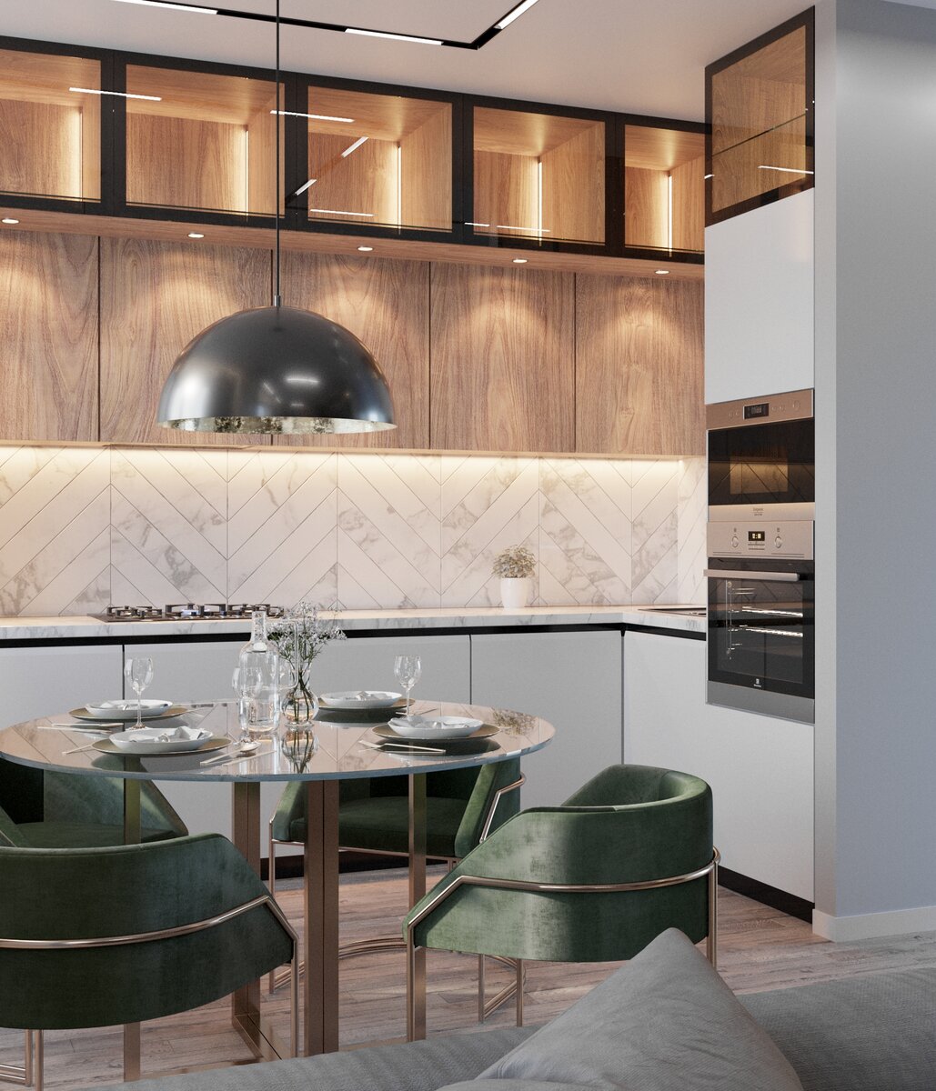 Также сам кухонный гарнитур может быть выполнен и вовсе в современном стиле без использования латунных элементов, но его присутствие в окружении плитки с имитацией мрамора, золотых или латунных элементов в других предметах мебели отлично впишет его в интерьер ар-деко
