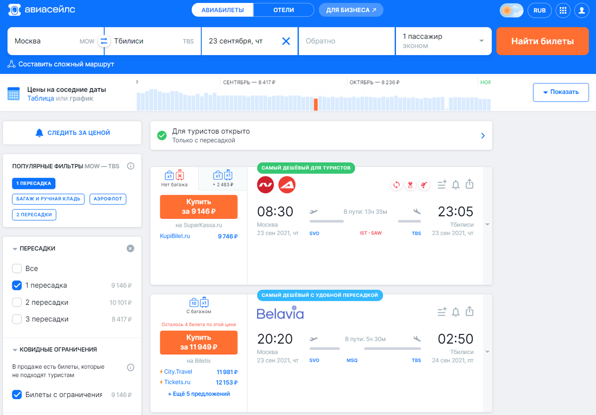Авиасообщение с Грузией было приостановлено по инициативе России еще летом 2019 года. Сейчас закрыты и наземные границы (со стороны РФ). Удобнее всего попасть в Грузию самолетом через Турцию. Поищите авиабилеты с пересадкой в Стамбуле. Второй вариант – лететь через Минск. Третий способ – купить билеты из вашего города в Ереван. А затем пересечь наземную границу на поезде, маршрутке или даже на такси. Отслеживайте выгодные предложения на сайте Aviasales. Можно поймать распродажи от турецких авиалиний (например, Pegasus) и прилично сэкономить.