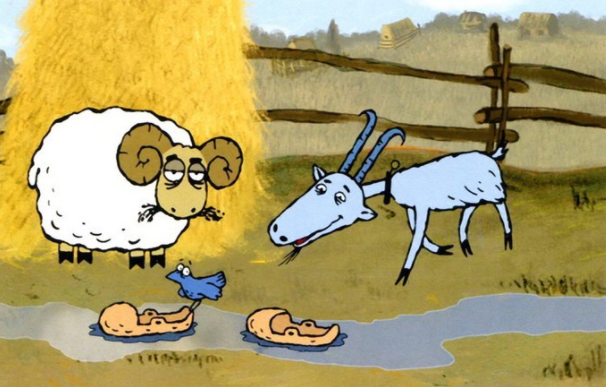 Были у одного мужика баран и козёл. Жили - не тужили, с воробьём дружили. Как-то раз понаехали к хозяину гости. Решил он зарезать барана - он повкуснее будет, чем козёл. Бросился козёл к барану: - Беда! Зарежут тебя! - Что делать? - Бежим в лес. - А сено? - Да там полно сена. - Ну, давай бежать, - согласился баран. Пошли они в лес. Баран еле ноги передвигает. А хозяин уж нож наточил. Козёл вытолкал барана за забор и сам пролез. Тут и воробей за ними увязался. Баран задел мешок на заборе, и мешок повис у него на голове. Решили взять мешок с собой - авось, пригодится. Вышел хозяин за бараном - а того и след простыл. И козёл куда-то пропал. Идут козёл и баран и увидели коровий череп. Козёл говорит: - Ух ты! Ну и башка! А знаешь, сунь-ка ты эту черепушку в мешок. - А на что нам этот череп? - спросил баран. - Ты возьми, в хозяйстве-то всё сгодится. Взяли они коровий череп и пошли дальше. Воробей с ними летит. Сначала весело было, а как в лес вошли, смеркаться стало. Было страшно и холодно.
