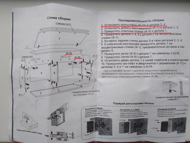 Найдя инструкцию по сборке, я сразу поразилась ее неоправданному минимализму и качеству распечатки. Хм, как всё… просто… Но неужели нельзя было более качественно напечатать один-единственный лист? Первые полчаса прошли незаметно и с энтузиазмом. Я делала все точно по инструкции, не торопясь и аккуратно читая каждый пункт: «1. Установить кронштейны (Ф-39) в детали 3, 4.». Смотрю на картинку и делаю. Далее второй шаг, но потом что-то пошло не так…