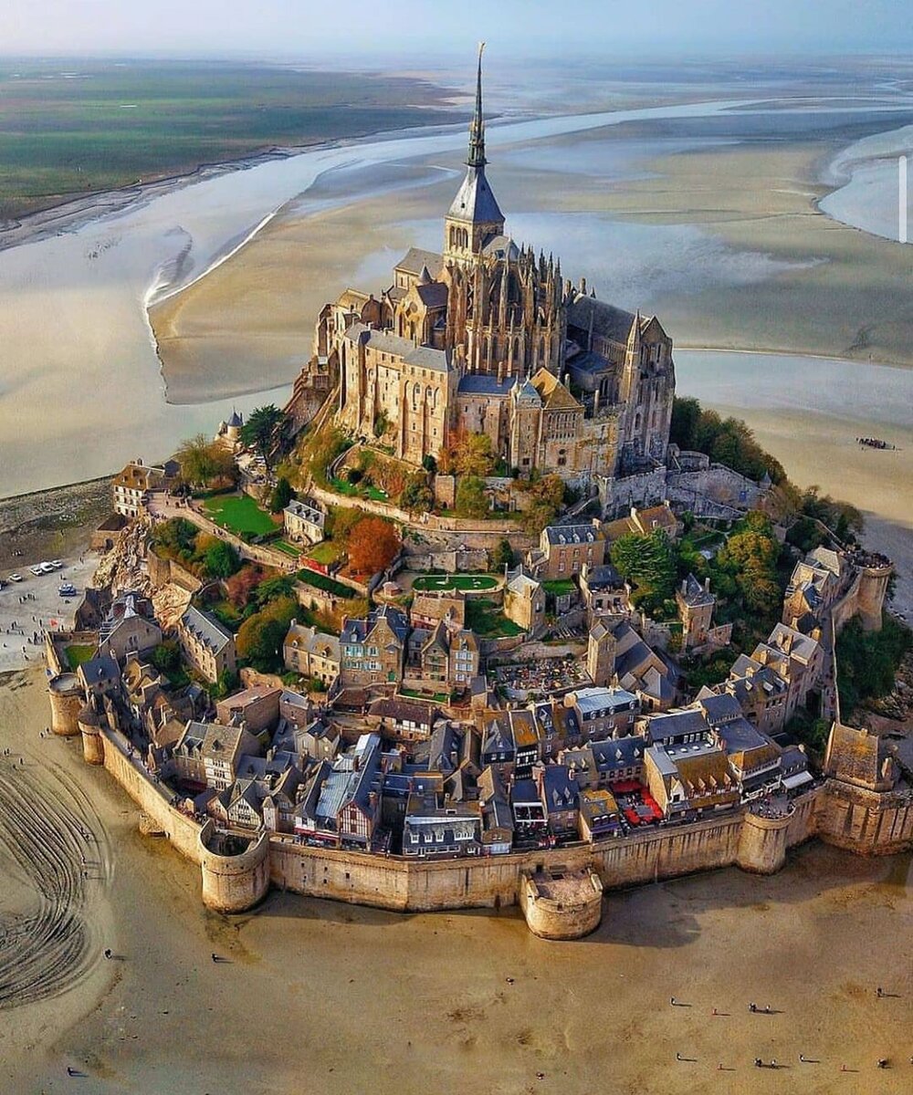 Замок Мон-Сен-Мишель построен на скалистом острове, который полностью окружен водой. Это даже не совсем замок, а аббатство, которое строилось на протяжении нескольких веков. Город на острове возник в 709 году. Сегодня там проживает всего несколько десятков жителей. Но замок является одной из самой посещаемой достопримечательностью во Франции. Существует несколько легенд о том, как появился Мон-Сен-Мишель. Согласно одной из них, несколько великанов пытались унести огромные камни. Но далеко не смогли уйти с ними. Бросили их, свалив в кучу. Так и образовалась гора не далеко от пролива Ла-Манш, на которой впоследствии появились первые жилища. Есть еще одна легенда появления замка. И она более популярна. Согласно этой легенде в 708 году к епископу Оберу во сне явился Архангел Михаил и наказал построить на скале монастырь. Обер послушал архангело не сразу, а лишь с третьего раза, когда архангел разозлился и ткнул епископа своим перстнем в голову. В качестве доказательства этой версии возникн