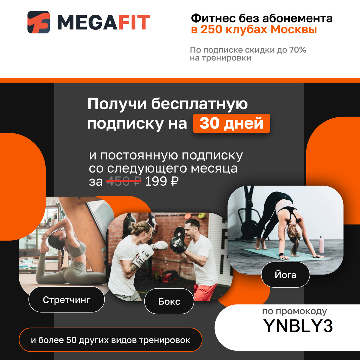 Получи 30 дней бесплатного пользования сервисом, а также постоянную скидку на ежемесячную подписку – 199 рублей вместо 450 рублей. МегаФит — сервис подписки, который дает возможность тренироваться в сотнях клубах Москвы без покупки абонемента. Вы оплачиваете по специальным сниженным ценам только те тренировки, которые реально посещает. Для занятий не нужно оформлять абонемент в фитнес-клуб – по ежемесячной подписке в вашем распоряжении все фитнес-клубы Москвы
