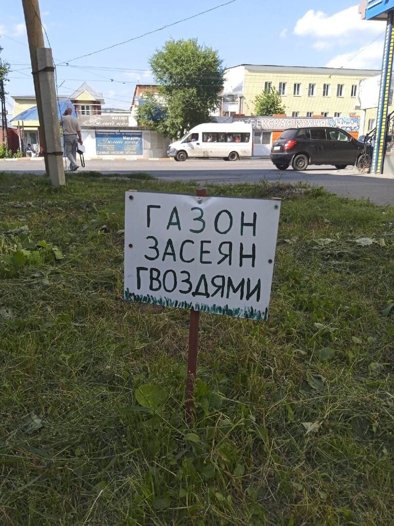 В Златоусте местным жителям надоело , что альтернативные гении считают себя умнее других и ставят свои колымаги на газон. Решение стало довольно разумным, так как достаточно было просто поставить табличку с "Газон засеян гвоздями", чтобы водители боялись ставить свой транспорт. о