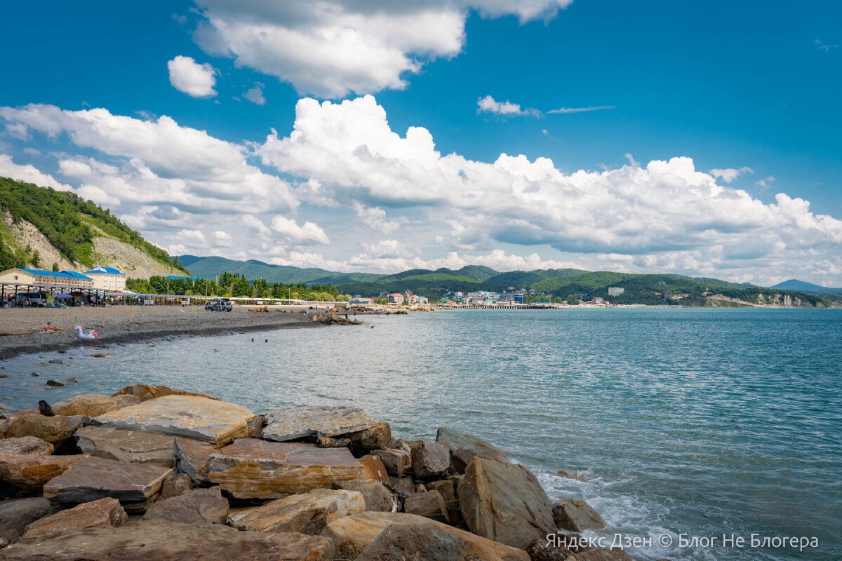 Третий день отдыха в курортном городке Лермонтово порадовал нас потрясающей солнечной погодой. С самого утра светит солнышко, а пушистые кучевые облака только придают дополнительный колорит, и дополняя деталями местные ландшафты. Честно говоря, мы совершенно случайно оказались в этом месте. Я никогда не любил галечных пляжей и в основном мы предпочитаем выбираться в Витязево или Благовещенское. Но оказавшись проездом в окрестностях Джубги, все-таки решили сделать остановку и не пожалели об этом ни на минуту. В этой поездке нам повезло вдвойне. Мы наконец-то отыскали неплохой благоустроенный кемпинг, с удобным подъездом к морю и всеми условиями для комфортной стоянки с автодомом. Собственно, прямо сейчас я расположился в удобном раскладном кресле в пятнадцати метрах от береговой линии, и пишу в блог эти строки, наслаждаясь потрясающим видом на бирюзовую гладь воды. Поводом написать сегодня эту статью стала небольшая фотосессия, которую мы спонтанно провели с супругой, пока прогуливалис