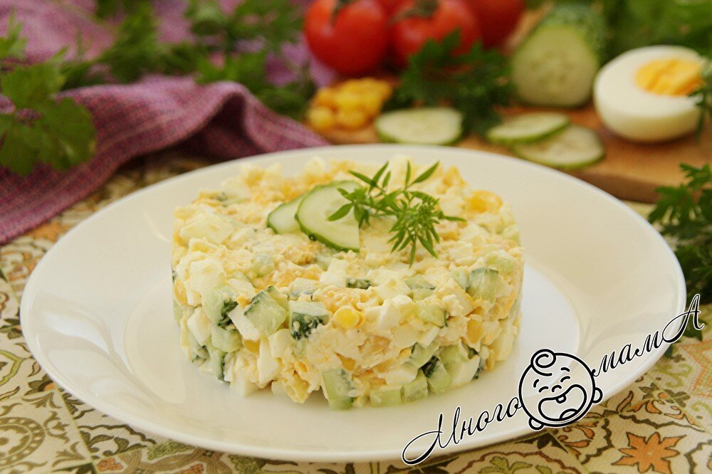 В нашей семье есть любимая закуска, которую мои дети называют салатом из ГУМа. Все потому, что я рассказала им историю появления этого рецепта в нашем доме. Много лет назад, когда я была еще ребенком, мы с мамой проездом были в Москве и решили пообедать в столовой ГУМа. Нам настолько понравился салат, который мы там попробовали, что мама записала его состав на салфетке, а по возвращении домой часто баловала нас вкусной закуской. С тех пор ни один праздничный стол не обходится без этого салата. Сейчас я готовлю его своим детям, и они бегут на кухню, когда узнают, что сегодня будет их любимое угощение. Готовится салат легко и очень быстро. Для приготовления нам понадобятся: Заранее отвариваю яйцо и помещаю его в холодную воду, чтобы оно легко очистилось. Огурец мою, обсушиваю и удаляю кончики. Перед тем как нарезать в салат, я всегда его пробую, и если он слегка горчит, то срезаю кожуру. Нарезаю огурец на кубики среднего размера. Кукурузу откидываю на сито и дожидаюсь, когда стечет вся