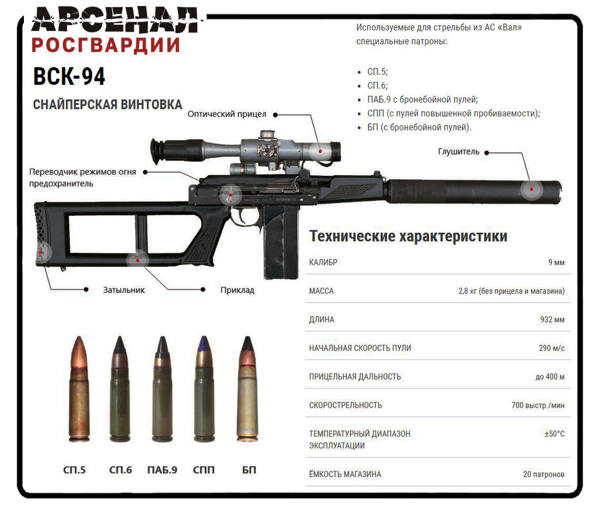 На помощь пришли тульские конструкторы: в сжатые сроки им удалось создать винтовочный снайперский комплекс ВСК-94, который по основным характеристикам не уступал «Винторезу».