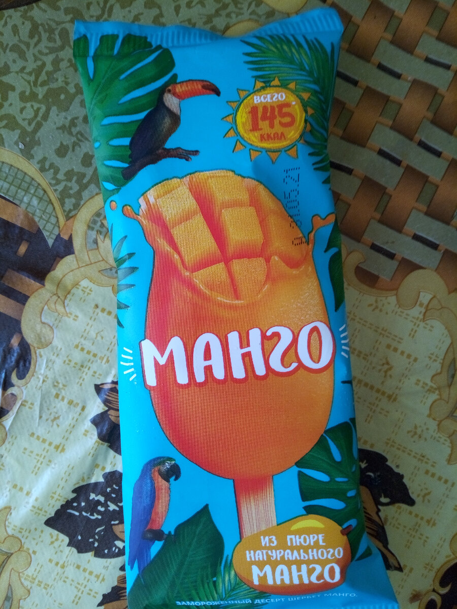 Сегодня отправилась за чем-нибудь охладительным. И в магазине напоролась на мороженое из манго. Меня привлекла яркая,и красивая упаковка,темболее ,что раньше я такого мороженого нигде не видела(а может и не замечала),я взяла одно,цена по акции 49'90р. Дойдя до дома,а это 2 минуты, мороженое стало значительно мягче. Естественно я сразу открыла,т.к.было интересно. Но внутри упаковки не было ничего не обычного. Мороженое цвета манго,без начинки. Приятное на вкус,нежное,но мне больше напомнило дыню,чем манго. Мороженое мне понравилось,ставлю 4/5,но покупать врятли больше буду.