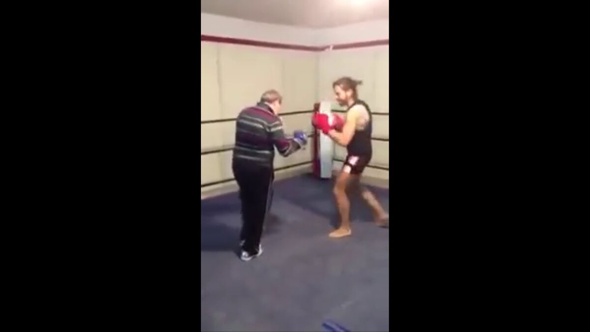 А у деда похоже все хорошо с реакцией, он видит прямые удары парня и с легкостью от них уклоняется. После дедушка вообще включает режим "разрушителя" и идет в размен с молодым спортсменом, жестко орудуя размашистыми "крюками" и "кроссами". Баааам. Один из таких ударов достигает цели, парень оказывается в нокдауне, но сразу встает.