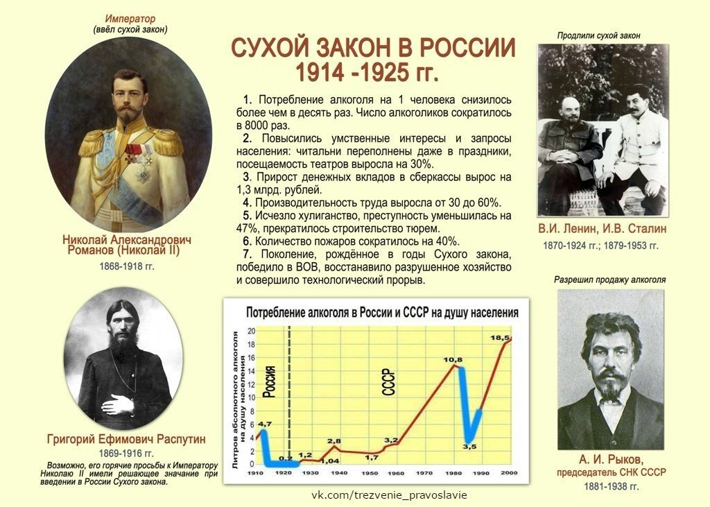 В 1914 году в России был издан царский указ, запрещающий производство всех видов алкоголя на всей территории России. Сначала торговлю спиртным запретили на месяц – в начале Первой мировой войны на время мобилизации. Затем продлили на всё время войны. В то время алкоголь купить можно было только в ресторане. И даже с учётом того, что появились многочисленные способы обойти закон, среднее потребление алкоголя в России на 1 человека снизилось в 10 раз. К уровню 1914 года страна вернулась только в 1960-х годах. По статистике 1914 года в Петербурге на 70% сократилось количество арестованных в нетрезвом состоянии, в 29 раз количество вытрезвляющихся, на 50% количество самоубийств на почве алкоголизма, а вклады в сберкассах увеличились на 1,3 млрд. рублей. Правда, в стране начало процветать потребление суррогатов и тайное самогоноварение. С приходом Советов борьбу с алкоголизмом продолжили, продлив в 1917 году запрет на торговлю водкой. В 1919 году постановлением за подпись Ленина запрещалось