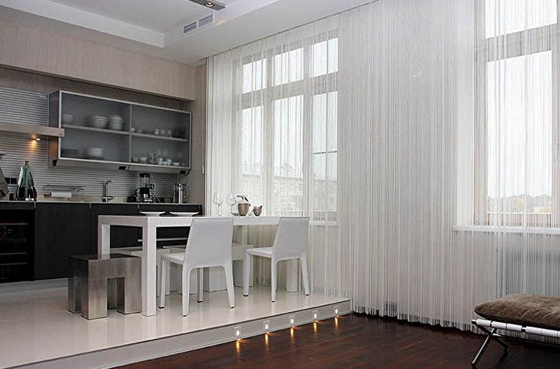Крик души дизайнера! Посмотрите на подборку фотографий и никогда не делайте так! Нитьевые шторы завоевали любовь и популярность, как только появились, среди россиян, но очень часто они просто портят интерьер! Такие висюльки, подвязанные ленточками, как на фото, вызывают не очень приятные ассоциации, лично мне напоминают волосы, не мытые неделю или 2. Разве такую функцию должны нести шторы в интерьере, вместо украшения и итогового штриха? Такие шторы больше подходят в салоны красоты, шоурумы, магазины, на крайний случай разделить зоны в комнате. В общем, я настоятельно рекомендую всем своим клиентам отказаться от использования нитьевых штор. Однажды заказчица возмутилась: «Почему вы считаете, что они ужасно смотрятся? Мне, например, очень нравятся нитьевые шторы. Хочу повесить их и в зале, и в спальне». Я ни в коем случае не навязываю свою точку зрения, а только ее выражаю. В любом случае, выбор всегда за вами. Прекрасная альтернатива такому исполнению – классическая тюль. В магазинах п
