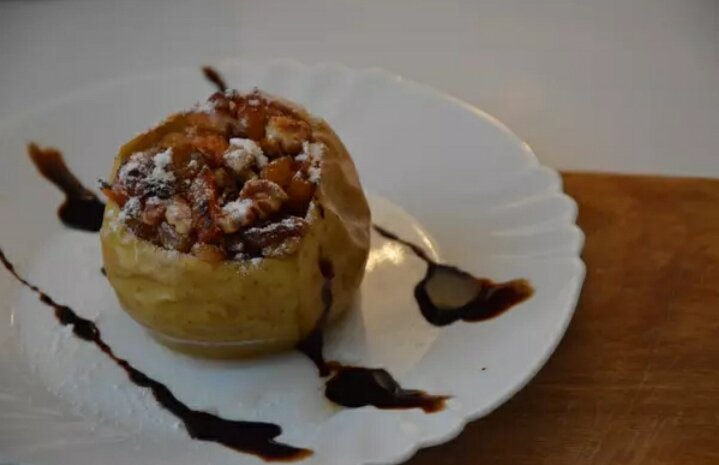 Представляю вашему внимаю простой, но не менее вкусный рецепт запеченных яблок. На три порции нам понадобятся следующие игредиенты: 3 шт яблока🍏 2 ст л меда🍯 горсть грецких орехов, кураги и изюма🥜 15 г коньяка🥃 сахарная пудра и бальзамический крем-соус для украшения🍽 Приготовление: 1. Яблоки помыть и достать сердцевину. 2. Грецкие орехи покрошить, но не мелко. 3. Курагу порезать поперек на небольшие полоски. До этого залить кипятком изюм и курагу на 15 минут. 4. Смешать орехи, изюм, курагу. Залить медом и коньяком. Все тщательно перемешать. По желанию добавить корицу. 5. Положить смесь в яблоки. Яблоки выложить в форму и налить немного воды. Готовить в духовом шкафу 30 минут при 180 С. 6. Украсить сахарной пудрой и бальзамическим крем-соусом. Приятного аппетита! Не забудьте поставить 👍 и подписаться на мой канал!🍎