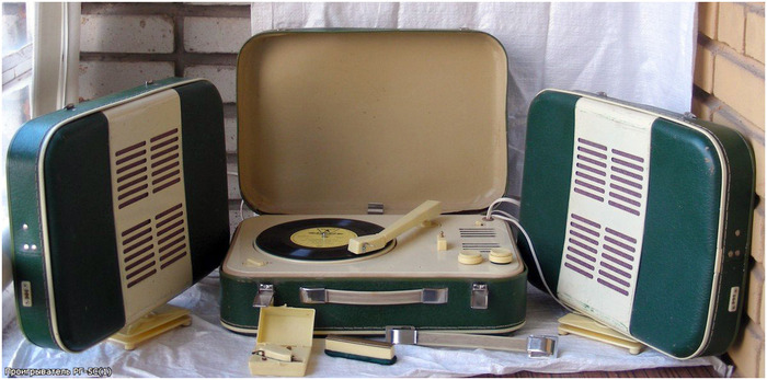 А вот так система выглядит в походном режиме. Ну когда вы в гости с ней пошли. Один чемодан это вертушка. А во второй объединились колонки. Заметьте, как хитро ручка на втором чемодане размещена. Она сразу и к одной колонке и к другой.