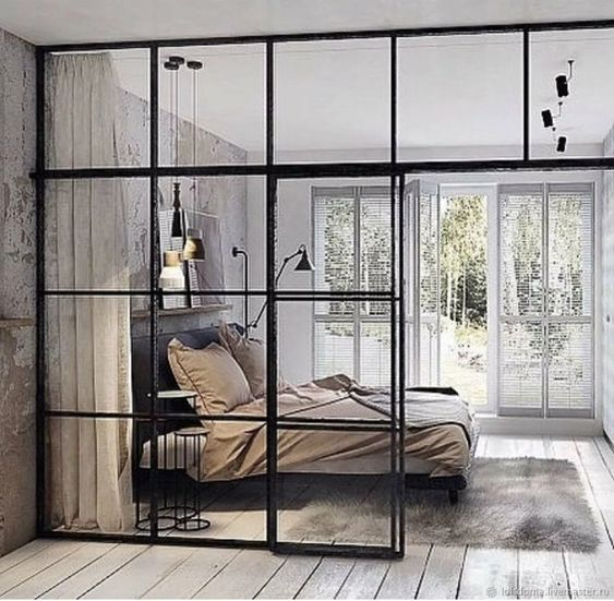 Квартиры-студии достаточно удобно планировать. Одно большое пространство можно оформить в любом стиле. Но отсутствие стен с одной стороны хорошо, а с другой — не очень: сложно выделить спальное место. Особенно если в студии проживает несколько человек и хочется как-то обозначить, где в доме гостиная, а где — спальня. Как можно разграничить пространство квартиры, не теряя общей привлекательности интерьера? У нас есть перегородки, ширмы, рейки и колонны. Перегородки бывают стеклянными, деревянными, гипсокартонными, металлическими. Роль перегородки могут выполнять стеллажи, шкафы и шторы. Стеклянные перегородки идеальны в сохранении пространства, так как пропускают свет и практически незаметны в самом помещении. Совместите их с деревянной и металлической окантовкой — и вот вам отличное дизайнерское решение. Деревянные перегородки более плотные, они добавляют комнате солидности. Но если устанавливать кровать в глубине помещения, нужно делать перегородки либо раздвижными, либо открытыми, по
