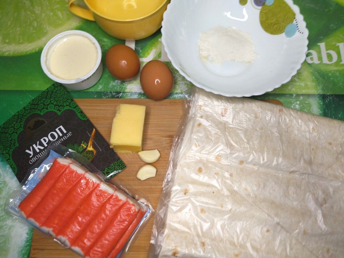 Для приготовления блюда нам понадобится: В первую очередь сделаем смесь для смазывания лаваша. Для этого берём весь плавленый сыр, на тёрке нарезаем твёрдый, чеснок размельчаем. Тщательно перемешиваем. Далее делим лаваш на 3 одинаковых листа. Берём первый лист и промазываем его половиной нашей сырной смеси. Посыпаем укропом. Поверх кладём половину мелко нарезанных крабовых палочек. Накрываем вторым листом лаваша. Затем его тоже смазываем оставшейся сырной смесью, кладём крабовые палочки, но уже без укропа. Нарезаем лаваш с начинкой на квадратики / прямоугольники. Далее берём яйца и смешиваем их с мукой, взбиваем до однородной массы. Теперь приступаем к обжарке. Берём каждый кубик лаваша с начинкой, обмакиваем его целиком в яйце с мукой и обжариваем в большом количестве растительного масла на сковороде примерно по 3 минуты с каждой стороны. По итогу получается такая жирная и вкусная закуска.
