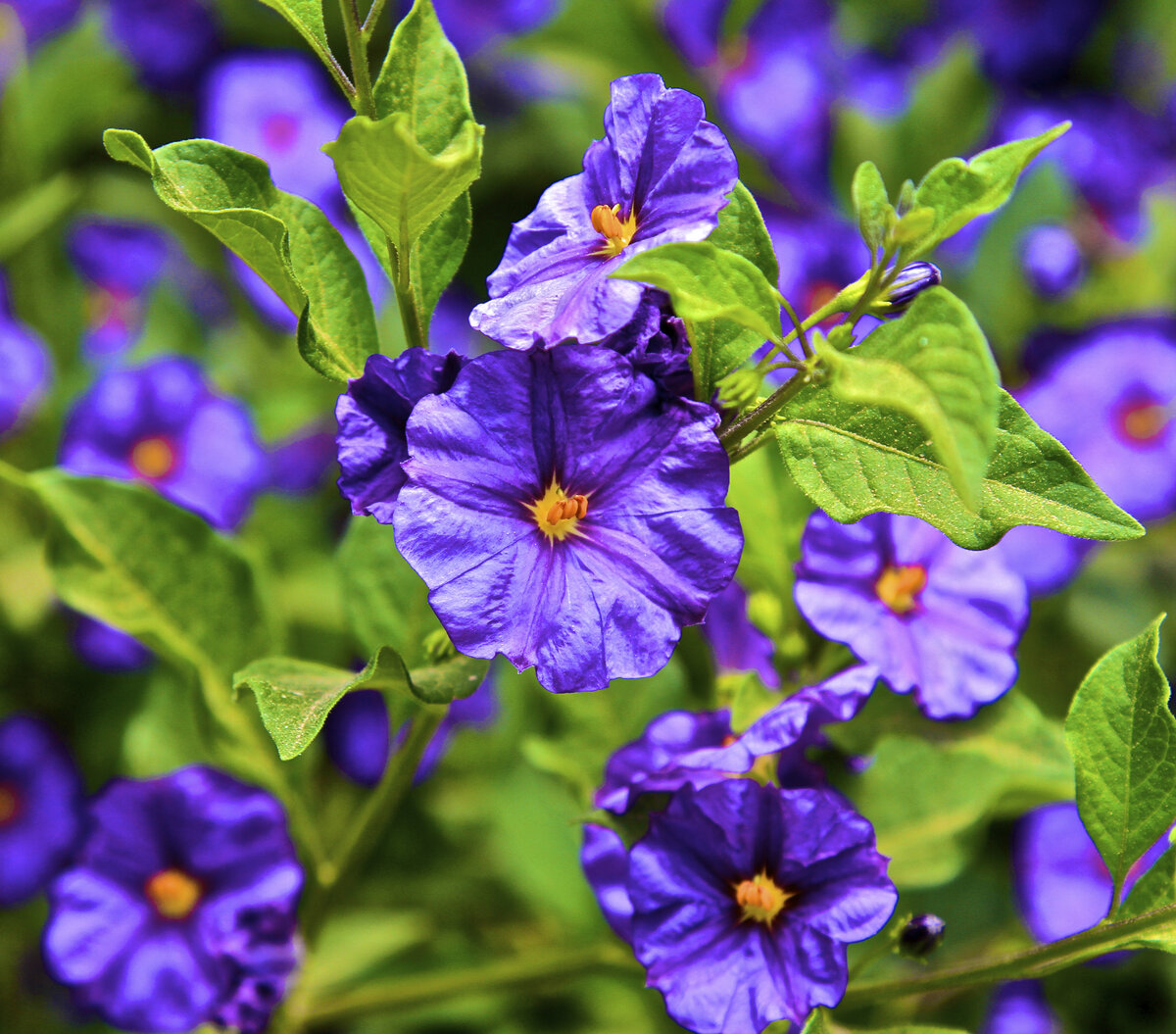 Очень необычное растение, которое цветет с мая и до самых заморозков. В природных условиях его можно увидеть в Южной Америке, где оно вырастает в форме кустарника до трех метров высотой. В нашей стране мы растим его в открытом грунте только в летний период, так как растение теплолюбивое и не выносит заморозков. Зимой растение храним в подвале, погребе, либо растим его как горшечное. Наверняка многие слышали о картофельном дереве, хотя к картофелю оно не имеет никакого отношения. Настоящее название растения паслен горечавковидный. Сразу скажу, что этот вид паслена не является съедобным. Напротив, красные ягодки, которые образуются после цветения ядовиты. Это растение мы выращиваем в качестве декоративного, так как оно обильно и долго цветет, неприхотливо в уходе. Растение всегда привлекает внимание, так как имеет внушительные размеры, за сезон оно вырастает до двух метров. Не пугайтесь, что растение такое большое. Оно прекрасно переносит обрезку и прежде, чем внести его в дом на зимний