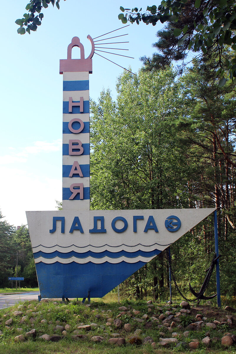 Лично для меня город Новая Ладога начинается с самого начала. То есть с оригинальной въездной стелы, которая встречается далеко не в каждом населённом пункте. Было бы интересно узнать автора проекты этой стелы?