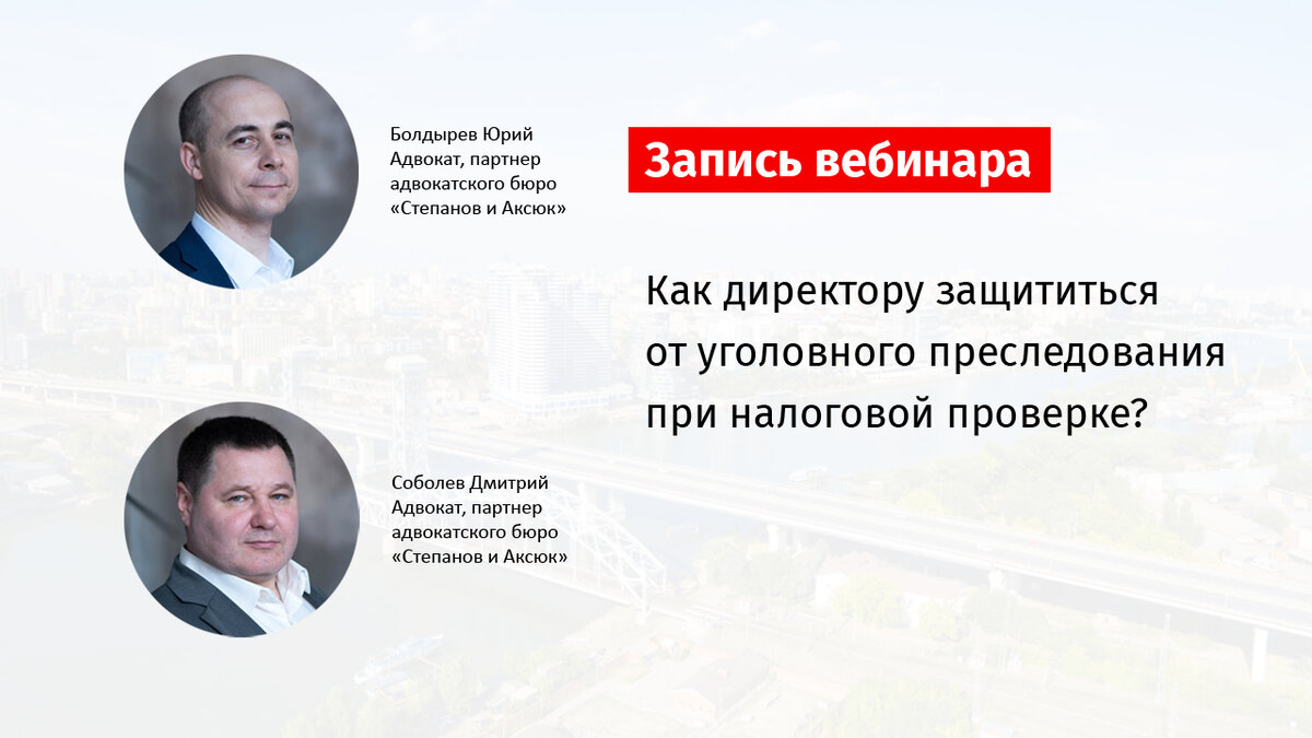 Как директору сохранить личное имущество и защититься от уголовного преследования при налоговой проверке? На эту тему мы провели вебинар 4 августа 2021 г. Если вы пропустили вебинар или хотите посмотреть повторно, сделали для вас запись. Спикеры вебинара: - Болдырев Юрий Павлович – партнер Адвокатского бюро «Степанов и Аксюк», адвокат, руководитель налоговой практики. - Соболев Дмитрий Николаевич - партнер Адвокатского бюро «Степанов и Аксюк», адвокат, руководитель практики уголовно-правовой защиты бизнеса. Что обсуждали на вебинаре: 1. Дорожная карта директора по налоговой проверке. 2. Банкротство компании в результате налоговой проверки 3. Уголовное преследование директора в результате налоговой