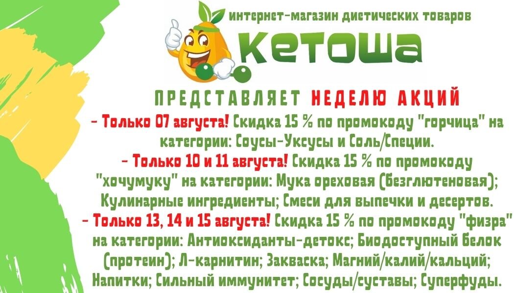 Ура! В интернет-магазине КЕТОША.РФ начались жаркие дни! Лучшие скидки на любимые товары/продукты. Присоединяйся! Если Вам близка или интересна тема кето-питания или просто здорового питания, то приглашаем в наши группы ВКонтакте, Фейсбук, Инстаграм, Одноклассники и канал на Ютьюб. Подпишись, читай и получай много полезной, вкусной и здоровой информации! Если Вы хотите ознакомиться с нашим ассортиментом и приобрести любой понравившийся продукт, то заходите на наш сайт. Пишите и звоните, мы с радостью ответим на Ваши вопросы, проконсультируем и поможем подобрать лучшие продукты! Доставка по РФ, Беларусь, Казахстан и Киргизия. Доставка по Санкт-Петербургу 150 руб. Бесплатный самовывоз из Санкт-Петербурга.